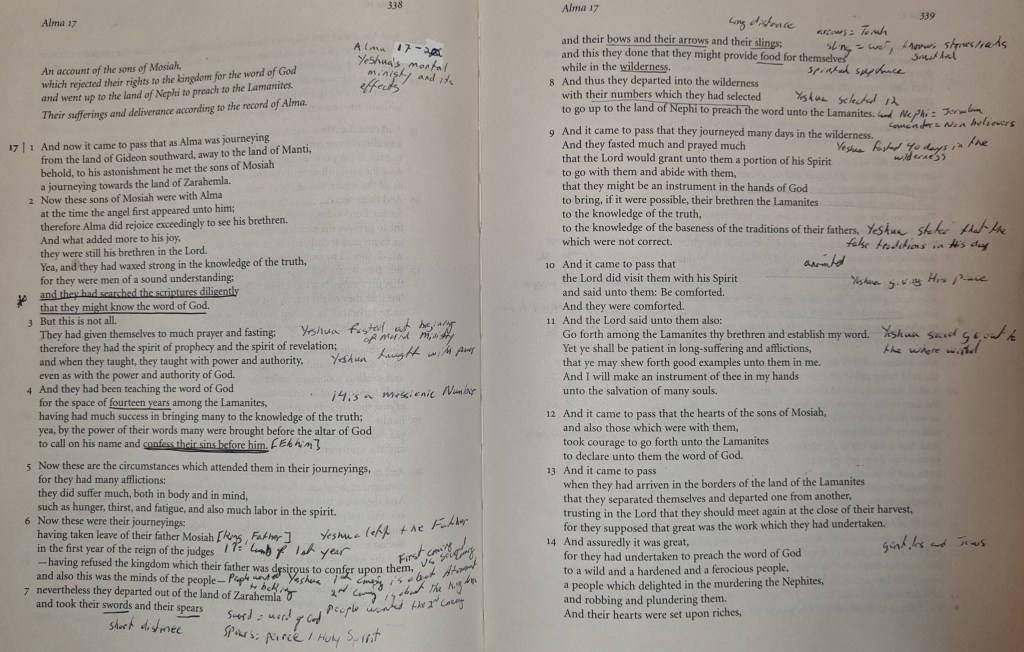 Above is a picture of my notes from Alma (LDS 17:1-14) (RLDS 12:1-24). Alma (LDS 17-20) (RLDS 12) is a type of Yeshua’s / Jesus’ mortal ministry, His atonement, the resurrection, and insights about the second coming. Below are the Scripture Studies I have done thus far on this section that gets into the details.