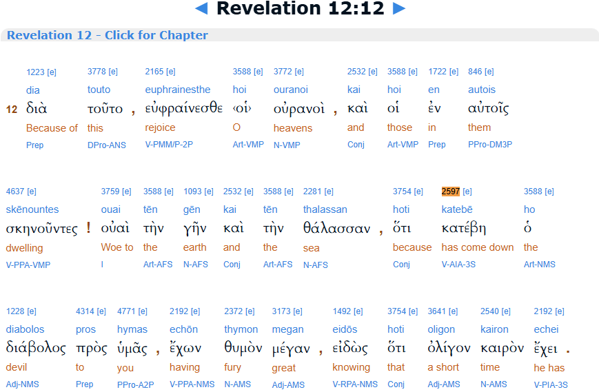 Revelation 12:12, Interlinear, BibleHub