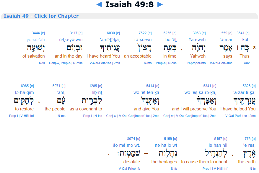 Below is SJR Isaiah 49 in chiasmus form. Along with my SJR Translations within {} next to the strikethroughs that my SJR Translations are replacing. I have some quick notes inlined inside [] which are called glyphs, to help others see what I see without spending lots of time explaining why I see that. After the SJR Isaiah 49 chiasmus, I explain the SJR Translations I did along with some insights that goes along with them.