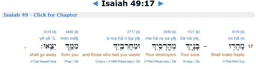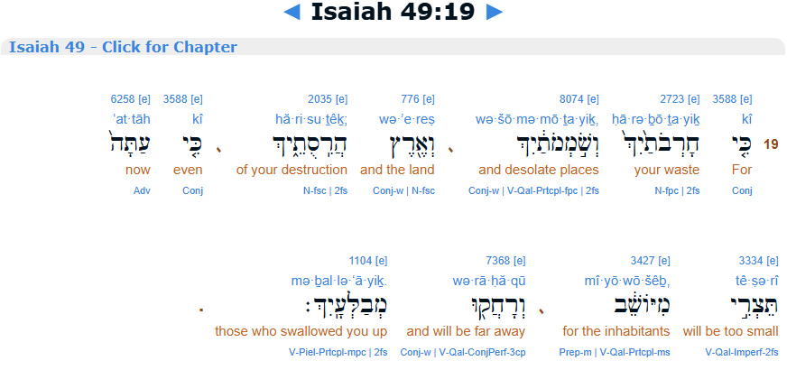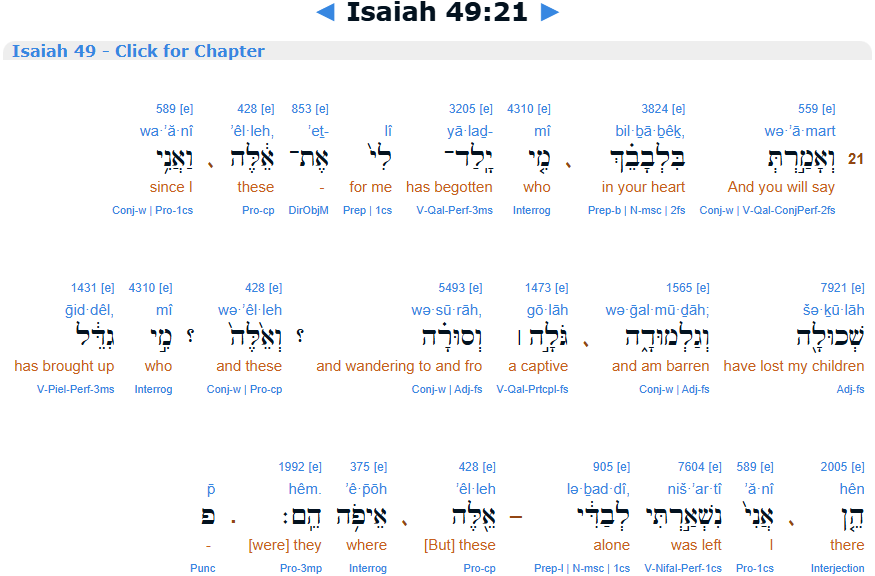 In SJR Isaiah 49:21, I translated “H1473: golah” as “exile” because of the overall context of Isaiah 49:20-23 being the 5th Seal from the Book of Revelation and what will be happening during that period of time, see Second Coming resource page for details on that. And how Zion is exiled or removed from the world. My translation also corrects the chiasmus stanzas to supporting each other instead of contrasting each other for the same subject which is a contradiction.