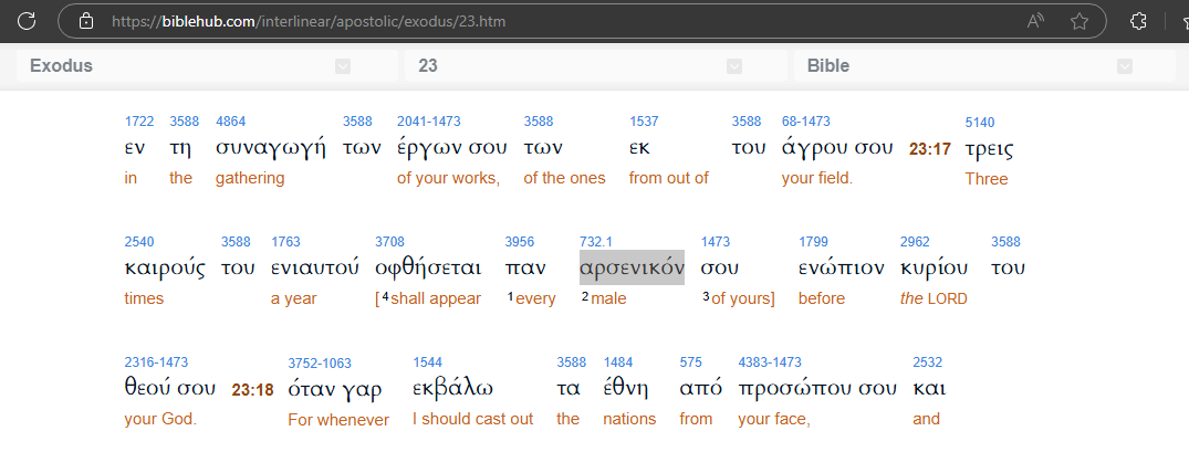 Searching for all the instances of “αρσενικόν” on Blue Letter Bible to better understand what “αρσενικόν” means yields 23 verses.