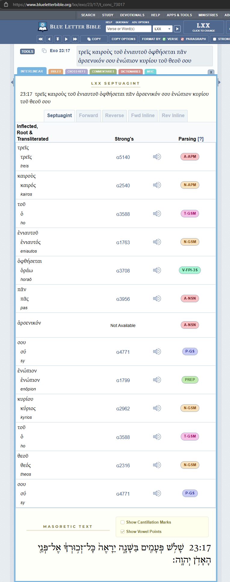 190 – 230 AD is long before any English translations of the Bible were attempted. The first English translation was in 1382 AD by John Wycliffe and his followers. Next was William Tyndale’s from 1525 – 1535 AD. After that was Miles Coverdale in 1535. These three translations were referenced in the first King James Version of 1611. During translation, the translators referenced the traditions of the Jews, such as Mishnah Chagigah 1:1, to guide their translations. But both “H2138: zakur” for the Masoretic text and “αρσενικόν” for the LXX / Septuagint in Exodus 23:17, Exodus 34:23, and Deuteronomy 16:16 does not mean male. The definition of “H2138: zakur” for the Masoretic text is mindful or covenanted. The definition of “αρσενικόν” is dedicated or set apart.