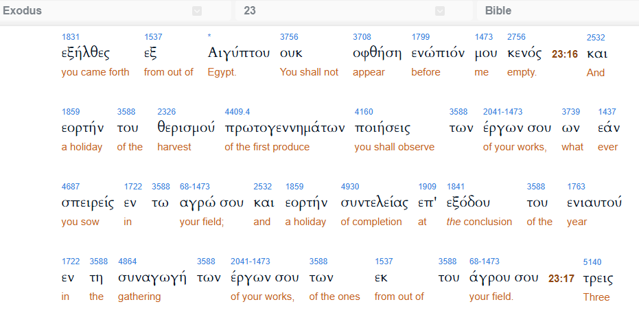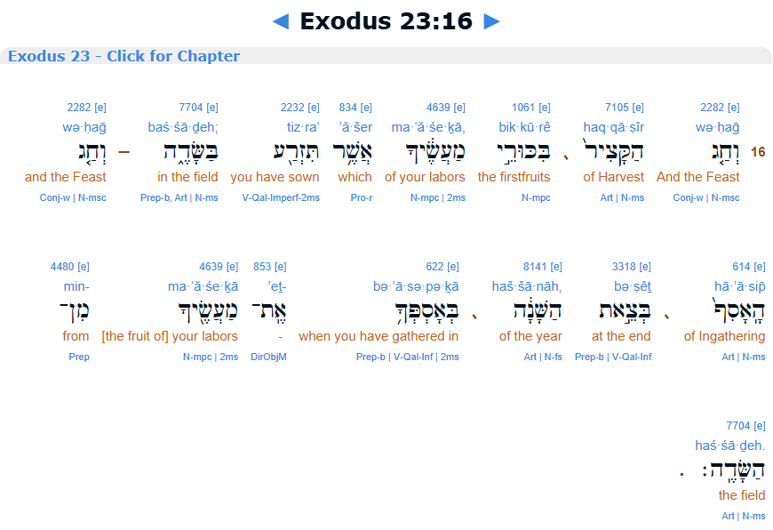 Lets first look at Exodus 23:16. I changed “H8141: shanah” from “year” to “cycle” because I believe it makes more sense with the context of Exodus 23:14-17, which deals with harvesting crops from the first, middle, and end of the agricultural cycle. This is supported by the fact that when you look at the background for “H8141: shanah“, the agricultural cycle is a big deal for the Hebrew word. I added the filler word “harvest” to make the context of what Exodus 23:14-17 is talking about more clear. Translators add filler words on a regular basis to help with the different ways that different languages conceptualize ideas, as you can see with the Exodus 23:16 Interlinear below.