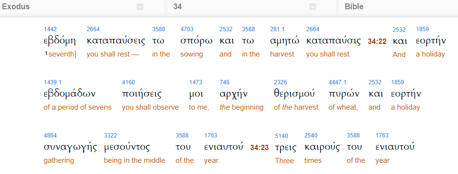 ABP Exodus 34:22 is more interesting, because it states that Tabernacles is in the MIDDLE of the year, which Tabernacles is indeed in the MIDDLE of the year when you know that the start of the year is in the spring. “G3322: mesoó” does indeed mean middle. What I believe that happened with the LXX / Septuagint / Greek translation is that the seventy translators brought out how Tabernacles is in the middle of the solar year instead of the end of the argicultural cycle because that is how the Greek culture, the intended audiance of the translation, did things. There is a tricky balancing act that needs to take placewith any translation. Does it focus more on a literal translation, leaving idioms that won’t be understood in the new culture and language, or does it focus more on protraying the same concept in a way the new culture and language would better understand it? I believe the LXX / Septuagint / Greek translation focused on the concept in a way the new culture and language understood things. The LXX / Septuagint was initially written for Ptolemy II Philadelphus of Egypt, later the Israelites did use it, see A Brief History of the Septuagint, The Origin of the LXX and Septuagint in Britannica.
